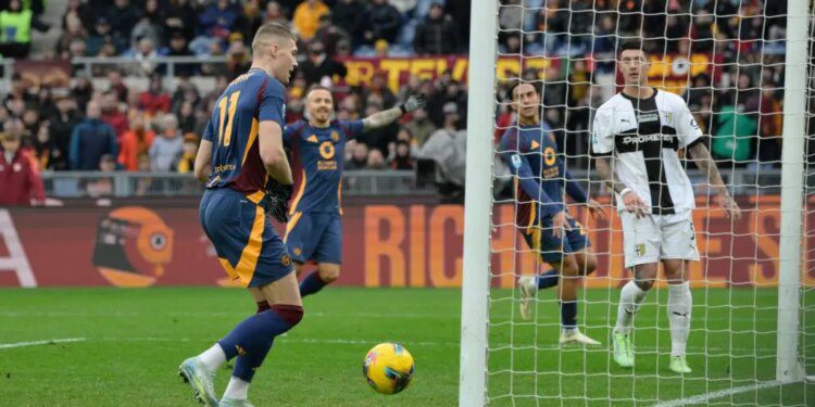 ROMA (ITALPRESS) – Tutto facile per la Roma che batte 5-0 il Parma nel match dello Stadio Olimpico, valevole per la diciassettesima giornata del campionato di Serie A 2024/2025: a segno Paulo Dybala (doppietta), Alexis Saelemaekers, Leandro Paredes ed Artem Dovbyk. La formazione ducale si ritaglia subito la prima occasione dopo appena tre minuti con una conclusione di Bonny, che termina sul fondo. All’8′ arriva la risposta del club giallorosso che conquista un calcio di rigore per un fallo di Balogh ai danni di Paulo Dybala: sul dischetto si presenta proprio l’attaccante argentino, che spiazza Suzuki e porta in vantaggio i suoi. Neanche il tempo di riorganizzare le idee per il Parma, che al 13′ i padroni di casa trovano la rete del raddoppio con Alexis Saelemaekers: gran palla di Angelino che sul lato opposto pesca il belga, il quale calcia al volo con il destro e firma il 2-0. Gli uomini allenati da Fabio Pecchia provano a reagire al 18′ con un bolide dalla distanza di Hernani, sui cui Svilar riesce a salvarsi con l’aiuto della traversa. Quattro minuti dopo è Valeri a calciare dalla distanza, ma il suo tentativo si spegne sul fondo. Alla mezz’ora sono sempre gli ospiti ad andare a caccia di un gol per riaprire la contesa, ma anche il tiro di Sohm non è preciso per impensierire Svilar. Nel finale del primo tempo è la Roma a tornare alla carica, costruendo un paio di occasioni con Hummels ed El Shaarawy, che vengono disinnescate da Suzuki.