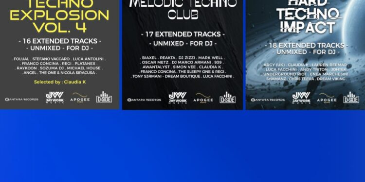 Jaywork Music propone 3 scatenate compilation elettroniche: Melodic Techno Club, Hard Techno Impact, Techno Explosion Vol. 4.