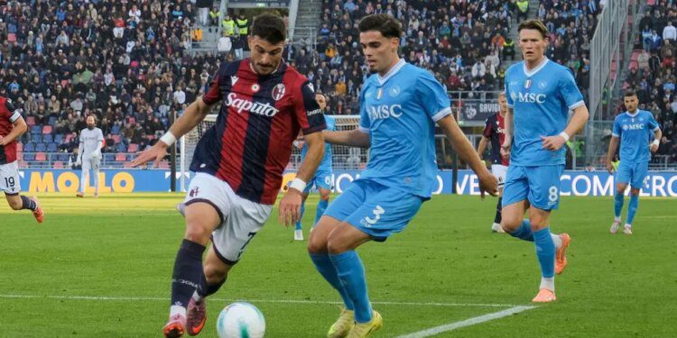 In apertura di ripresa il Bologna torna in campo con grande determinazione ed aggressività, tanto che al 50′ trova la rete del vantaggio con una girata al volo di Thijs Dallinga: l’olandese batte Milinkovic-Savic sul primo palo e capitalizza al massimo l’ottimo assist del neo-entrato Cambiaghi. Il Napoli prova a reagire, ma fa fatica a costruire delle trame offensive in grado di mettere in difficoltà i rivali. Al 63′ i felsinei si lamentano per un presunto cartellino rosso ai danni di Hojlund, che viene soltanto ammonito dopo aver rifilato un colpo a Ferguson. I rossoblù dimostrano di essere più in palla e al 66′ raddoppiano con Jhon Lucumì che, sul traversone di Holm, anticipa Buongiorno e realizza il colpo di testa vincente. Mister Antonio Conte prova a riaprire la contesa inserendo forze fresche, ma a prevalere è il nervosismo poichè Neres e Lang si fanno ammonire dopo pochi minuti. Al 76′ Gutierrez crea l’occasione più nitida per i campioni d’Italia: su un cross del terzino Holm rischia l’autogol colpendo il palo della porta difesa da Pessina. Gli sforzi profusi dall’undici campano non portano frutti, ma spalancano le porte al contropiede dei felsinei che, in pieno recupero, sfiorano il tris con Dallinga.