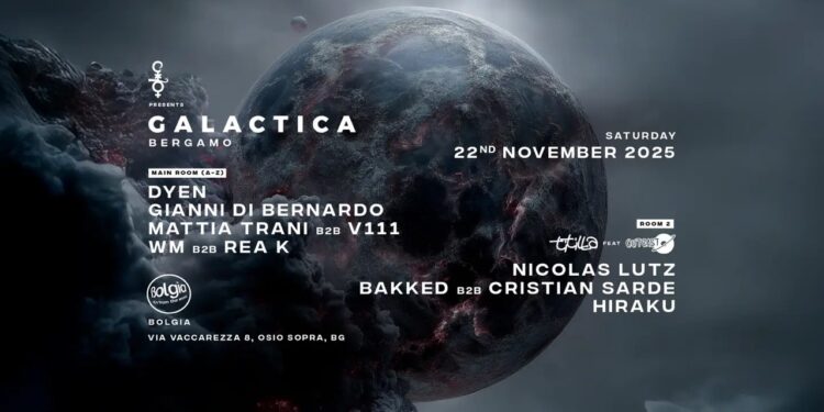 L’atmosfera irresistibile di Galactica il 22/11 fa poi muovere a tempo, in collaborazione Titilla feat. Outcast, la Room 2 del Bolgia. Anche qui la line up è d’eccezione: il sound è quello di prima di tutto quello di Nicolas Lutz, artista da tempo attivo a livello internazionale. Si è esibito per ben 6 ore al Womb di Tokyo solo qualche settimana fa. Con lui anche Bakked B2B Cristian Sarde e Hiraku. Il Bolgia di Bergamo anche il 22/11 per Galactica apre alle 23:30 e chiude alle 6.