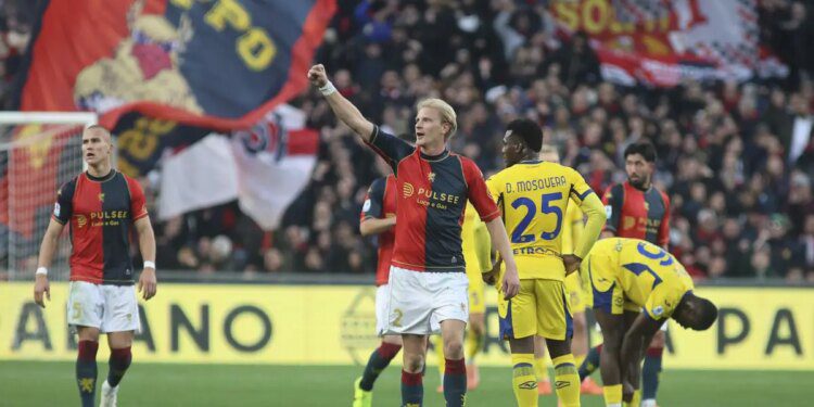 GENOVA (ITALPRESS) – Il Genoa si sblocca al Ferraris, mentre per l’Hellas Verona è notte fonda. Gli uomini di Daniele De Rossi superano 2-1 in rimonta gli scaligeri nel match valido per la 13esima giornata di Serie A 2025/2026 e portano a casa la loro prima vittoria stagionale tra le mura amiche, un successo interno che mancava dallo scorso campionato: decidono le reti di Lorenzo Colombo e Morten Thorsby. La partita inizia subito su buoni ritmi con Belghali che, al 10′, tenta la prima conclusione in porta, agevolmente neutralizzata da Leali. I padroni di casa spingono con maggiore convinzione, ma a trovare il gol del vantaggio in contropiede sono i gialloblù: al 21′ Rafik Belghali si avventa su una palla vagante messa in mezzo da un ottimo Mosquera e realizza il tap-in che vale lo 0-1. Dopo la gioia della rete, però, mister Zanetti deve fare i conti con l’infortunio di Bradaric, costretto ad abbandonare il campo: al 30′, dunque, arriva il momento di Frese. Il Genoa fa fatica a reagire, ma nel finale di primo tempo riesce ad agguantare il pareggio: al 40′ Vitinha lascia partire un cross per Colombo che, dopo aver controllato il pallone, batte Montipò con il mancino. Al termine dei due minuti di recupero le due compagini vanno a riposo sul parziale di 1-1. Nella ripresa i ragazzi di Daniele De Rossi (per lui prima vittoria sulla panchina del Grifone) provano a riprendere da dove avevano lasciato andando a segno al 51′ con Vitinha, ma la rete viene annullata per fuorigioco. Al 62′, dopo un clamoroso palo di Ostigard, i rossoblù completano il sorpasso grazie al gol di Morten Thorsby, bravo a trovare la deviazione vincente sull’assist di Ellertson. Zanetti prova ad attingere dalla panchina per rimettere la gara in equilibrio e al 69′ il neo-entrato Orban sfiora il pareggio con un tiro a colpo sicuro, sul quale Leali si supera. L’Hellas si riversa nella metà campo avversaria alla ricerca del pari, ma anche i padroni di casa si ritagliano delle occasioni interessanti, come il calcio di punizione di Malinovskyi che, al 77′, va vicino al tris. Gli ospiti tentano il tutto per tutto e in ben due occasioni sfiorano il 2-2, prima con Orban e poi con Giovane ma le loro conclusioni vengono respinte rispettivamente da Vasquez e Leali. I rossoblù difendono il 2-1 fino al triplice fischio e portano a casa un successo fondamentale in ottica salvezza, mentre i gialloblù rimangono ancora a secco di vittorie in questa stagione.