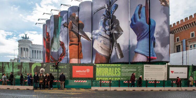 ROMA (ITALPRESS) – Piazza Venezia si conferma palcoscenico di arte pubblica con l’inaugurazione di ‘TOOLS’ di Elisabetta Benassi, la terza installazione del ciclo ‘MURALES. Arte contemporanea in metrò, opera omaggio alla comunità dei lavoratori – archeologi e operai – i veri ‘Eroi Nascostì, il cui sforzo quotidiano è oggi motore della trasformazione infrastrutturale di Roma. Il progetto artistico è realizzato grazie al consorzio costruttore della Linea C della Metropolitana di Roma guidato da Webuild e Vianini Lavori, con il patrocinio di Roma Capitale e in collaborazione con le Soprintendenze competenti, con l’obiettivo di trasformare il cantiere in un simbolo di innovazione e rigenerazione urbana, coniugando la bellezza di Roma con la sua necessità di evolvere. Alla cerimonia di svelamento dell’opera hanno partecipato il sindaco di Roma Roberto Gualtieri, Renata Cristina Mazzantini Direttrice della Galleria d’Arte Moderna e Contemporanea di Roma e presidente del Comitato Scientifico del progetto Murales e l’artista Elisabetta Benassi, insieme a Pietro Salini, Amministratore Delegato di Webuild e Vincenzo Onorato, Amministratore Delegato di Vianini Lavori. Presenti inoltre per il consorzio Metro C, Franco Cristini e Fabrizio Paolo Di Paola, rispettivamente Presidente ed Amministratore Delegato della società. “Roma è nata dal lavoro, dalla stratificazione incessante generata da mani, visioni e materiali, che hanno costruito la sua storia millenaria – ha dichiarato Salini – E’ questa la forza che l’opera celebra: il lavoro collettivo degli operai e degli archeologi che sta trasformando il sottosuolo per costruire la Roma moderna. Questo cantiere, che con il progetto ‘MURALES’ diventa una piattaforma culturale, è la testimonianza visibile di un impegno che va oltre l’ingegneria. Stiamo lavorando per contribuire a dare a questa città infrastrutture essenziali per la mobilità e la connettività. La Linea C è una spina dorsale della città realizzata in condizioni ingegneristiche e archeologiche complesse, che procede anche grazie alla stretta collaborazione tra imprese, istituzioni e comunità, con l’obiettivo comune di rendere Roma sempre più moderna e all’avanguardia”.