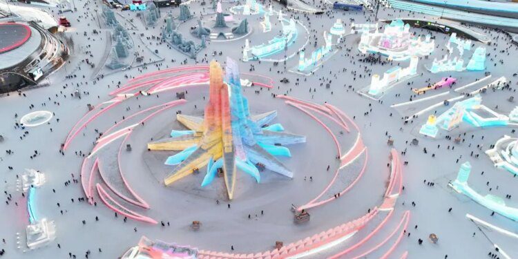 Il parco si estende su una superficie record di 1,2 milioni di metri quadrati e utilizza 400.000 metri cubi di ghiaccio e neve, e il tema di quest’anno è “Ghiaccio e neve, un mondo delle fiabe”.
