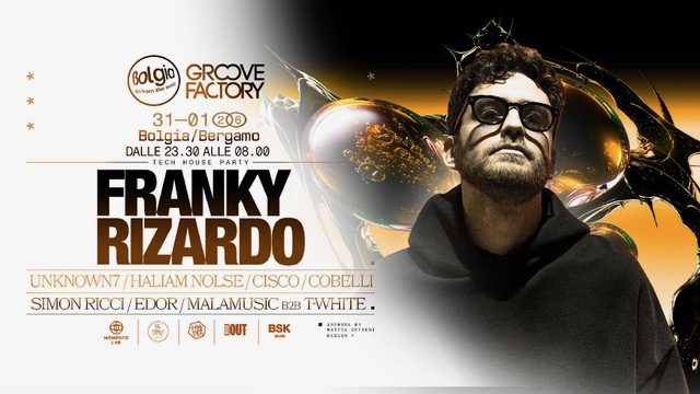 Al Bolgia di Bergamo, da decenni riferimento assoluto dell’elettronica internazionale, sabato 31 gennaio 2026, sul palco c’è l’olandese Franky Rizardo. Parte della family Music On e conosciuto per il suo brand FLOW, è capace di far scatenare i club di tutto il mondo. L’evento è firmato Groove Factory, il nuovo, lunghissimo concept dal ritmo tech house party del Bolgia. Si balla infatti alle 8 del mattino.