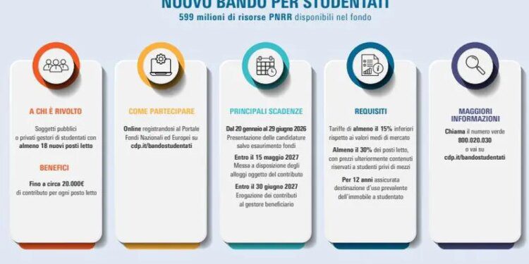 Per accedere ai contributi finanziari, le candidature, aperte a soggetti sia pubblici sia privati, potranno essere presentate attraverso il Servizio Telematico dedicato entro il 29 giugno 2026. A seguito della messa a disposizione degli studentati, CDP potrà erogare ai gestori delle strutture un contributo economico a fondo perduto entro il 30 giugno 2027. Ciascuna richiesta di ammissione dovrà prevedere almeno 18 nuovi posti letto per residenza e gli immobili dovranno trovarsi nel territorio di capoluoghi di provincia sede di ateneo o aree limitrofe. I gestori delle strutture saranno tenuti a garantire tariffe di almeno il 15% inferiori rispetto ai valori medi di mercato e riservare almeno il 30% dei posti letto, con prezzi ulteriormente contenuti, agli studenti fuori sede capaci e meritevoli anche se privi di mezzi. Inoltre, dovrà essere assicurata per 12 anni la destinazione d’uso prevalente degli immobili ad alloggio o residenza per studenti universitari.