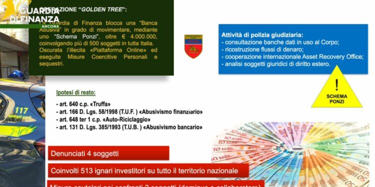ANCONA (ITALPRESS) – I militari della guardia di finanza del Comando Provinciale di Ancona hanno scoperto un istituto bancario parallelo basato su uno schema Ponzi, capace di movimentare oltre 4 milioni e di coinvolgere più di 500 persone sull’intero territorio nazionale. Nell’ambito dell’operazione, denominata “Golden Tree”, sono state eseguite misure cautelari personali, sequestri di conti correnti e l’oscuramento della piattaforma online utilizzata per le attività illecite. Secondo quanto ricostruito, il sodalizio criminale avrebbe dato vita a un istituto bancario parallelo e privo di autorizzazioni, con ramificazioni anche in Polonia e Bulgaria, in grado di offrire servizi tipici del settore finanziario: apertura di conti correnti esteri, concessione di prestiti e proposte di investimento. L’organizzazione operava dietro la facciata di una presunta “community” finalizzata al benessere dei propri affiliati. In realtà, dietro tale struttura si celava un sistema fraudolento che proponeva investimenti ad alto rendimento, presentati come particolarmente vantaggiosi e remunerati tramite la causale “cashback”, nel tentativo di eludere i controlli delle Fiamme Gialle. Le indagini hanno fatto emergere un vero e proprio schema Ponzi, diffuso in numerose province italiane, tra cui Ancona, Roma, Milano, Palermo, Napoli, Torino e Bari. Il sistema si autoalimentava grazie al passaparola e ai social network, trasformando gli stessi investitori in promotori, incentivati con compensi proporzionati al numero di nuovi clienti reclutati e alle somme versate. A rendere credibile l’operazione contribuivano anche strumenti apparentemente professionali, come una carta di debito fisica personalizzata e un’applicazione digitale che simulava un servizio di home banking. Il meccanismo, tuttavia, si sarebbe arrestato quando le richieste di rimborso hanno superato i nuovi versamenti: a quel punto, i promotori non avrebbero più restituito nè interessi nè capitale. Al termine dell’operazione, quattro persone sono state deferite all’Autorità giudiziaria per i reati di abusivismo finanziario, attività bancaria abusiva, truffa e autoriciclaggio.