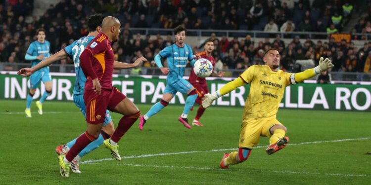 ROMA (ITALPRESS) – La Roma torna a vincere e aggancia di nuovo il quarto posto della classifica della Serie A. A sette giorni dal tonfo di Udine, i giallorossi stendono il Cagliari per 2-0, in casa, e raggiungono a quota 46 la Juventus, fermata sul 2 pari dalla Lazio ieri. In tribuna c’è anche Francesco Totti, al centro delle cronache dopo l’apertura di Claudio Ranieri per un suo ritorno in società. Gasperini lancia Pisilli dall’inizio e in attacco sceglie Pellegrini con Soulè e Malen. Per Pisacane assente Mina in difesa; davanti tridente Palestra-Kilicsoy-Esposito. La Roma fa la partita fin dai primi minuti. Al 18′ Caprile rischia una clamorosa autorete, prima di recuperare il pallone sulla linea e salvarsi all’ultimo. Si cercano gli inserimenti di Malen alle spalle dei difensori ospiti. Un piano che dà i suoi frutti al 25′, quando Mancini verticalizza sul centro-destra per l’olandese, bravo a bruciare il suo avversario, entrare in area e scavalcare Caprile con un pallonetto morbido per l’1-0.