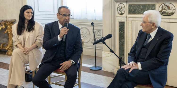 ROMA (ITALPRESS) – “La musica italiana è forte, viva, il Festival di Sanremo ne è la dimostrazione. Il Festival compie 76 anni, è un pochino più giovane della nostra Repubblica che proprio quest’anno compirà 80 anni. Do una notizia: in qualche modo su quel palco parleremo di questa importante ricorrenza e lo faremo ospitando una signora che ha 106 anni e che proprio quel 2 giugno del 1946 per la prima volta ebbe l’onore di votare. E’ il nostro modo per celebrare questa Repubblica e questa libertà che tutti noi abbiamo da quel giorno”. Lo ha annunciato Carlo Conti, conduttore e direttore artistico del Festival di Sanremo, ricevuto al Quirinale dal Presidente della Repubblica, Sergio Mattarella, assieme alla co-conduttrice, Laura Pausini, e ai partecipanti della 76° edizione del Festival. All’incontro era presente anche l’amministratore delegato della Rai Giampaolo Rossi.