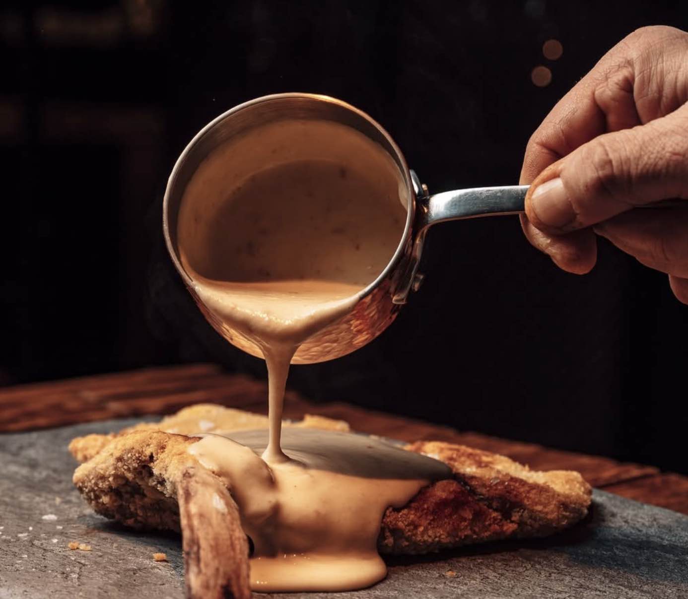 Parliamo di una cotoletta alla milanese davvero invitante. La carne è di vitellone e le dimensioni sono generose (ben 700 grammi). Dopo essere stata battuta come vuole la tradizione, viene impanata in farina, uovo e pangrattato e fatta cuocere nel burro chiarificato. Sulla cotoletta, a cui viene lasciato l’osso, gli chef di SVNTFV75 Costez grattano poi una generosa grattata di tartufo nero.