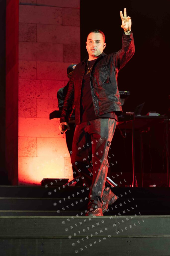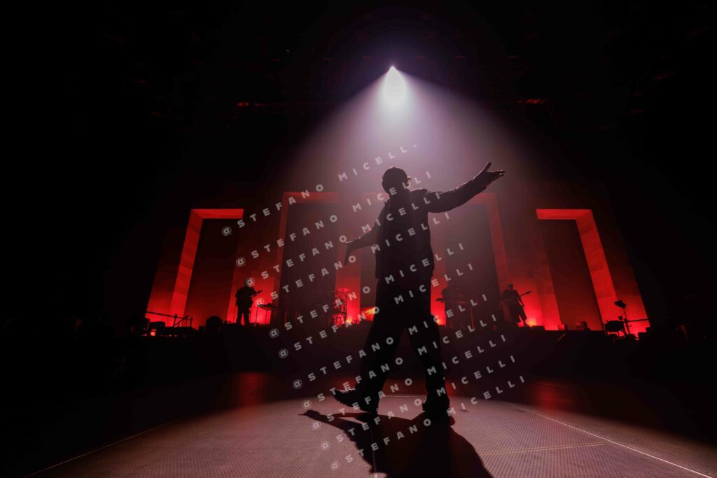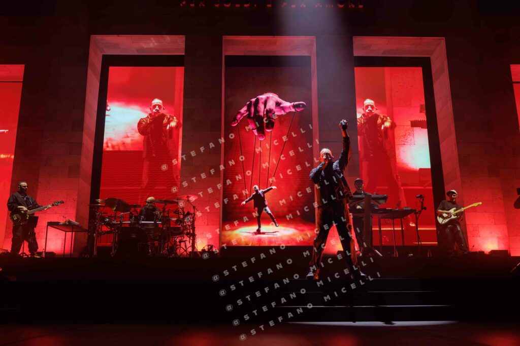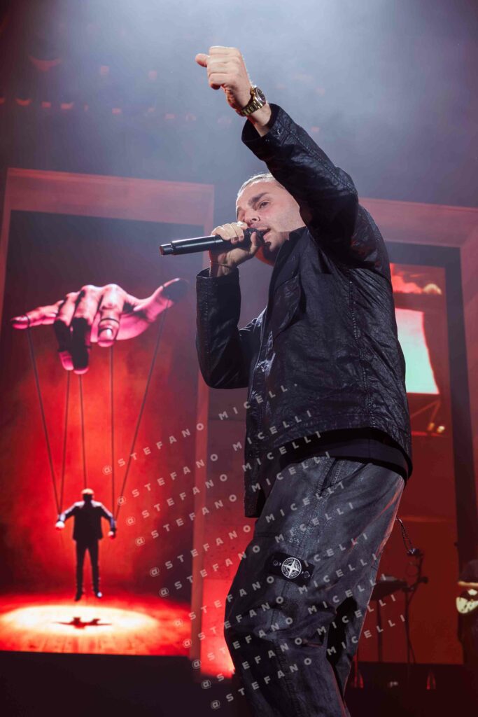 E’ stata l’occasione per portare finalmente live tutte le più grandi hit dell’artista e le canzoni presenti in “Per Soldi e Per Amore”, l’ultimo album diErnia, uscito lo scorso settembre. L’artista si muove sul palco, circondato dalla sua band, con alle sue spalle l’entrata di un edificio che ricorda il Palazzo di Giustizia di Milano, sua città natale. Ed è proprio la parola IVSTITIA a sovrastare l’intero palazzetto. Ogni azione, ogni emozione è ora sotto processo e la domanda è sempre la stessa: “L’hai fatto per Soldi o per Amore?”.