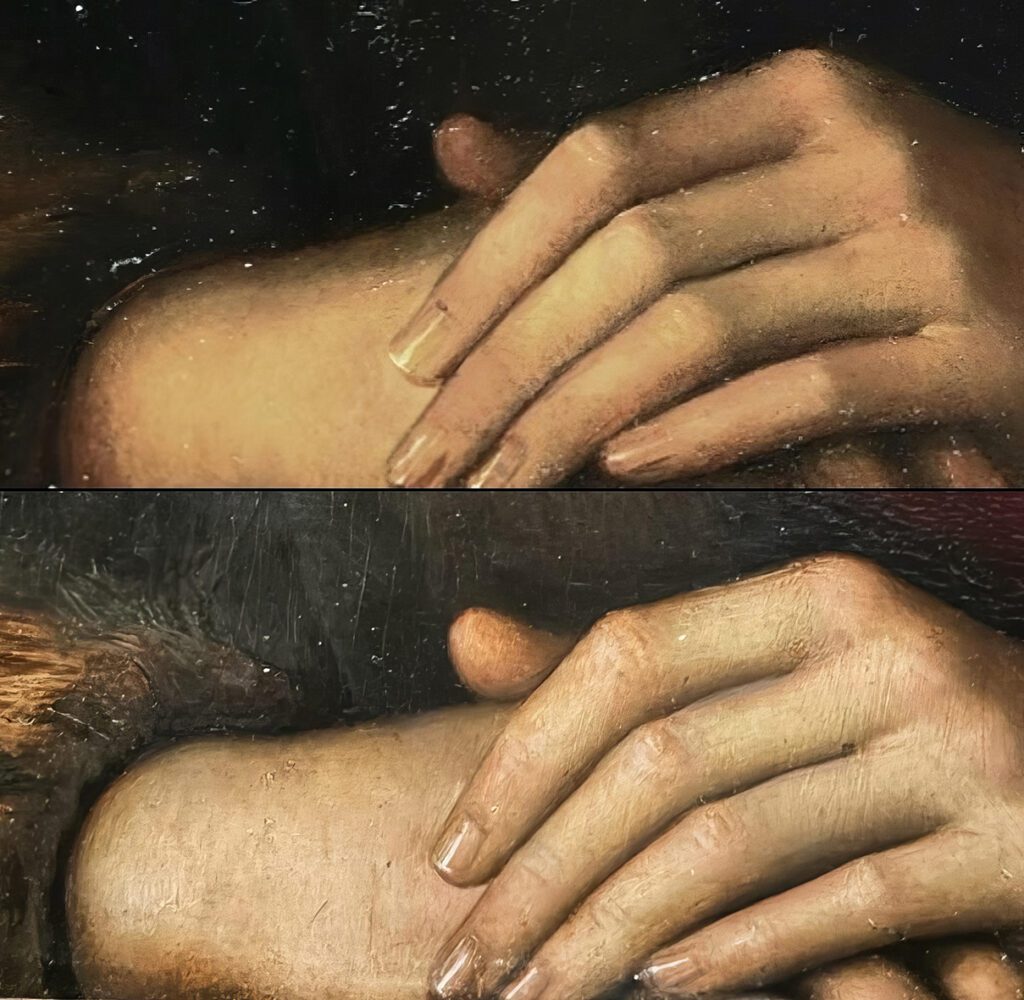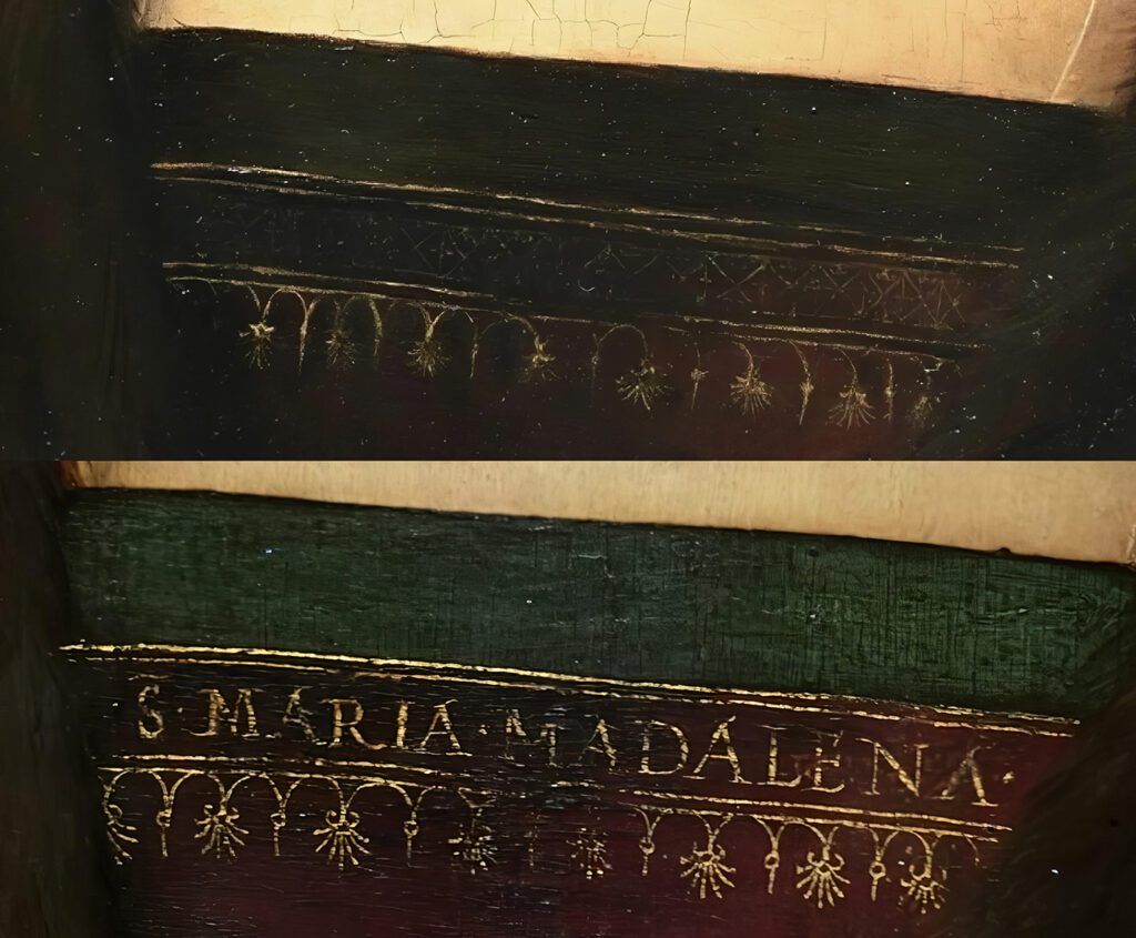 Nella storia dell’arte, una copia non si distingue sempre per una minore bellezza, ma spesso per una minore intelligenza esecutiva. Là dove l’originale elabora, la copia tende a semplificare. Un dettaglio sottile sembra andare in questa direzione. Nella versione riscoperta, il velo visibile all’altezza del busto si prolunga fino al polso; nella versione fiorentina, invece, la sua assenza, sostituita da una stesura scura e indistinta, finisce per dare quasi l’impressione che la mano si stacchi dal corpo, rivelando così una certa incoerenza materiale. Anche nel trattamento della mano la pennellata è troppo visibile, in contrasto con la tecnica rinascimentale. Per un occhio non esperto questo dettaglio può sembrare secondario; per uno specialista, al contrario, può risultare decisivo per distinguere un originale da una copia. A ciò si aggiunge un’altra anomalia: l’iscrizione sul busto, « S. Maria Maddalena », è formulata in volgare, laddove ci si aspetterebbe più naturalmente, in un simile contesto, una formulazione latina, maggiormente coerente con la cultura visiva colta del Rinascimento.