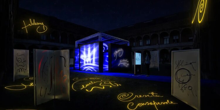 L’opera, ideata sul desiderio di coinvolgimento attivo dei cittadini, invita i visitatori alla costruzione di un racconto di un mondo più sostenibile grazie all’impegno collettivo e alla messa in campo di soluzioni concrete e innovative per affrontare le sfide climatiche. Nello specifico ogni ospite può dialogare tramite l’installazione sui temi dell’ambiente, della sostenibilità e del rapporto tra uomo e tecnologia. Un sistema di intelligenza artificiale generativa interpreta questi input e li traduce in tempo reale in immagini e parole proiettate sugli schermi luminosi dell’installazione e sull’intero cortile che la ospita, dando vita a una composizione visiva in continua evoluzione. L’opera è realizzata insieme al gruppo Domyn, che opera sulla centralità dell’essere umano nello sviluppo della IA.