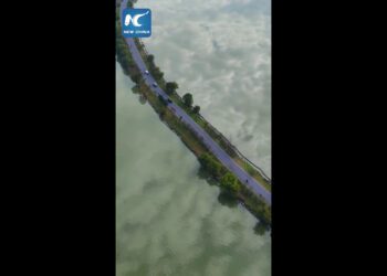 Il lago Pingtian, nella provincia cinese dell'Anhui, in queste immagini mostrano una straordinaria "Sky Road". La superficie liscia come uno...